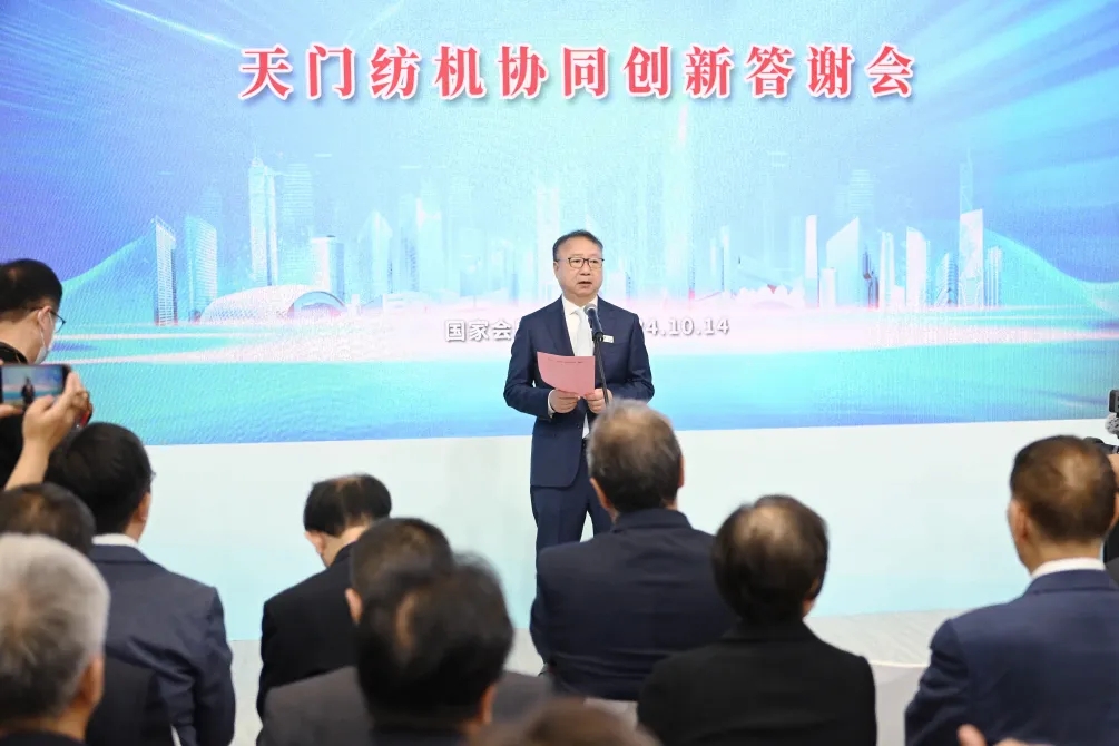 中國紡織工業(yè)聯(lián)合會(huì)會(huì)長孫瑞哲作了重要講話。他首先代表中國紡織工業(yè)聯(lián)合會(huì)對活動(dòng)的舉辦表示熱烈祝賀!向?yàn)樘扉T紡機(jī)并條技術(shù)進(jìn)步作出貢獻(xiàn)的功臣們致以崇高敬意!他在給予天門紡機(jī)“是當(dāng)之無愧的棉紡并條專家”的充分肯定與最高贊譽(yù)時(shí)強(qiáng)調(diào):作為紡機(jī)行業(yè)的中堅(jiān)力量,天門紡機(jī)扎根本土、布局全球、銳意創(chuàng)新、深耕專業(yè),在推動(dòng)民族紡機(jī)品牌自立自強(qiáng)中貢獻(xiàn)卓著。天門紡機(jī)的每一次成功與飛躍,是企業(yè)自身追求卓越、勇攀高峰的回報(bào),也是產(chǎn)業(yè)生態(tài)高效協(xié)同、價(jià)值共創(chuàng)的成果。他希望:在新征程上,天門紡機(jī)及其合作伙伴繼往開來、攜手共進(jìn)、一以貫之推進(jìn)紡機(jī)行業(yè)行穩(wěn)致遠(yuǎn),助力中國紡織行業(yè)新質(zhì)生產(chǎn)力發(fā)展。