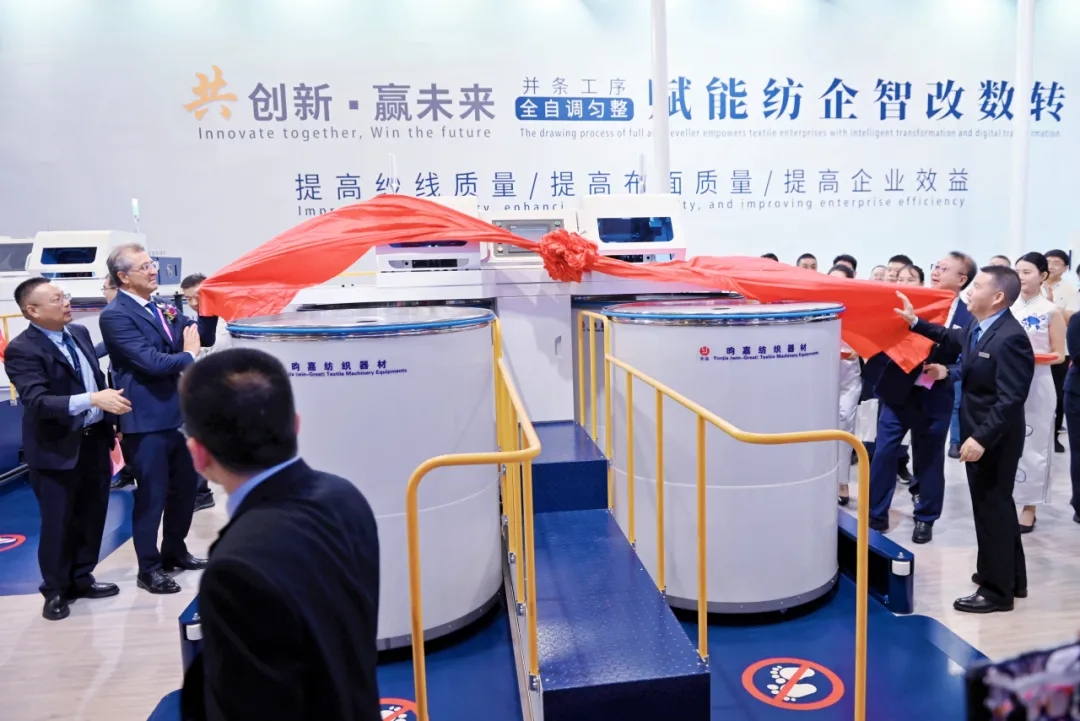 答謝會(huì)結(jié)束后,隨即舉行了新產(chǎn)品揭幕、開機(jī)儀式。天門紡機(jī)今年展出了TM23、TM27H、TM29H、TM35等四款型號(hào)的并條機(jī)。中國紡織工業(yè)聯(lián)合會(huì)孫瑞哲會(huì)長等行業(yè)領(lǐng)導(dǎo)、嘉賓一起為新產(chǎn)品揭幕,孫會(huì)長為展機(jī)啟動(dòng)開機(jī)。