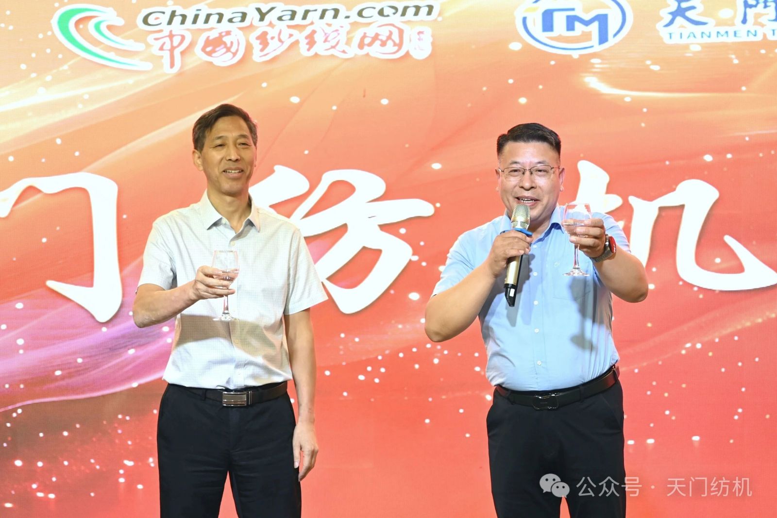 中國紗線網(wǎng)常務(wù)副總裁孫其海(左)、天門紡機(jī)市場(chǎng)總監(jiān)王繼文(右)為晚宴致辭